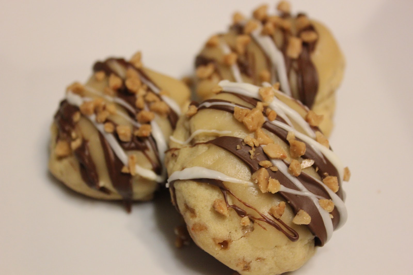Toffee filled cookies are topped with caramel icing, white and milk chocolate, and more toffee pieces!