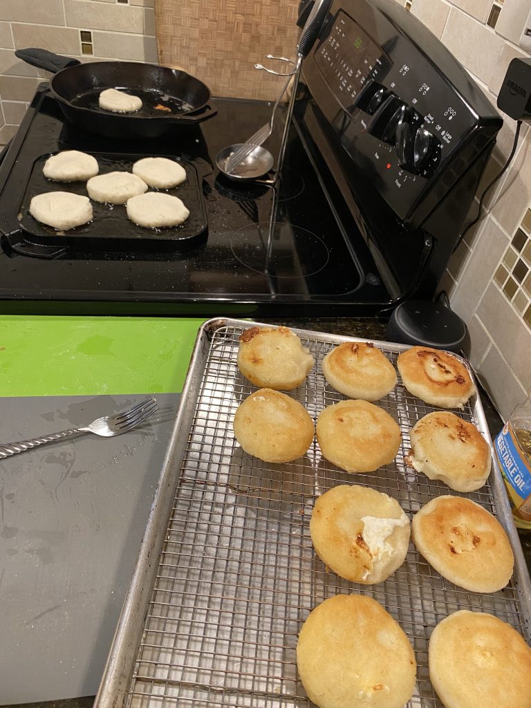 - Drop heaping tablespoons of the mixture into the oil – each one will be a fritter. Tip: Odd shapes are desirable (see photo). Fry at least 1 minute before disturbing – or until they have a more solid form – then gently turn. Fritters are done when they’re golden-brown on both sides. Remove from oil and allow to drain on a clean tea towel or paper towel.