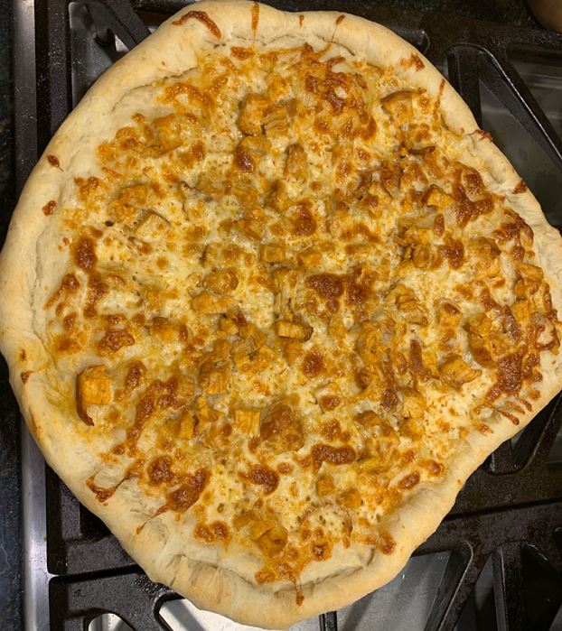 If making two pizzas, divide dough in half. Shape dough into desired size on prepared pan. Spread enchilada sauce over dough. Arrange onions, jalapeños and shredded seasoned chicken over sauce. Sprinkle with Parmesan cheese, Monterey jack cheese and mozzarella. Add chopped tomatoes and a sprinkle of ground black pepper.