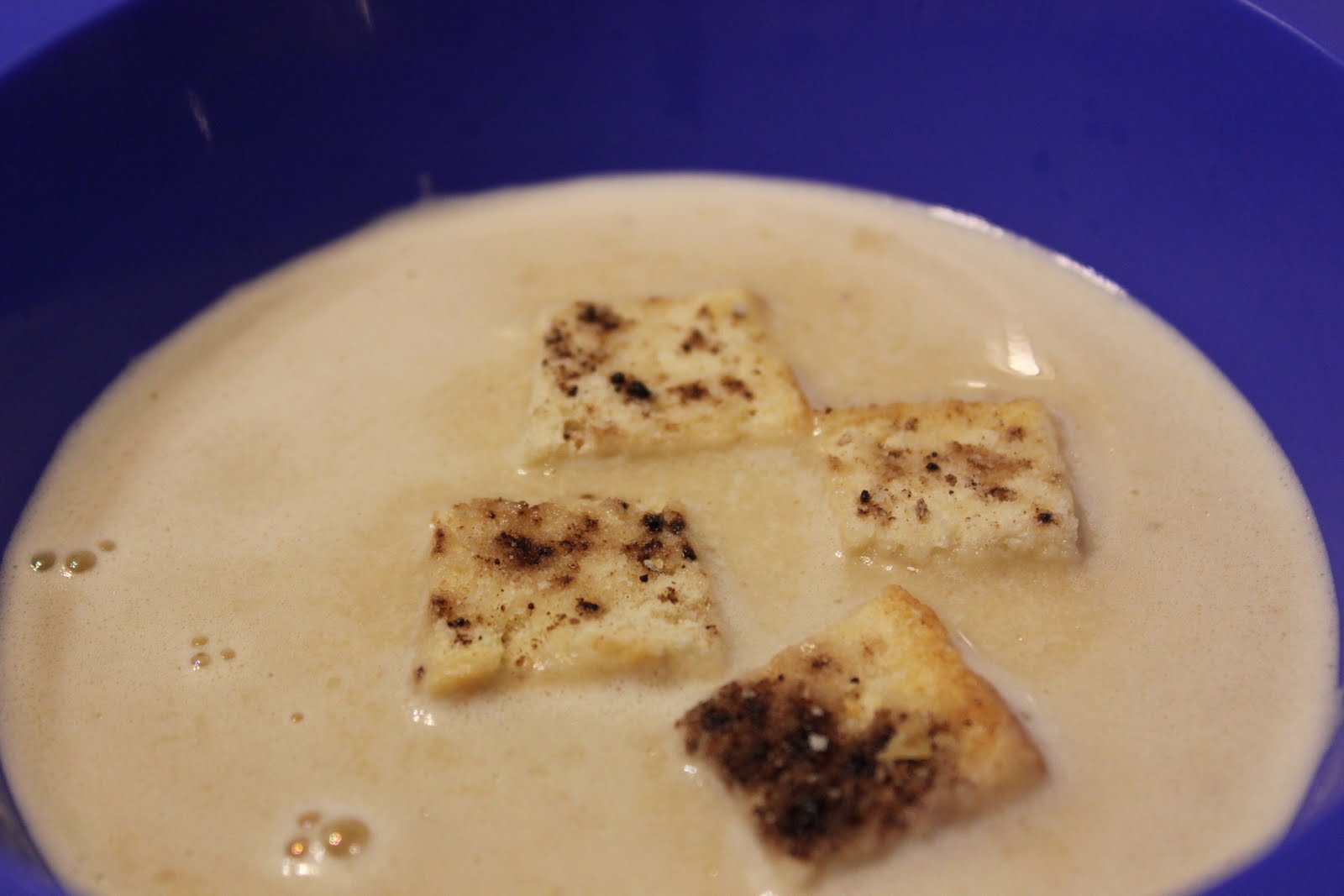 - Once you have the soup underway, toast the croutons in the oven which is already preheated to 400 degrees F. Cut the epee loaf into 3/4-inch thick slices. Brush the bread with oil and place on a foil lined baking sheet (important for cleanup purposes). Sift dark cocoa over the bread and toast briefly in the oven, just to make crispy. Remove and set aside.