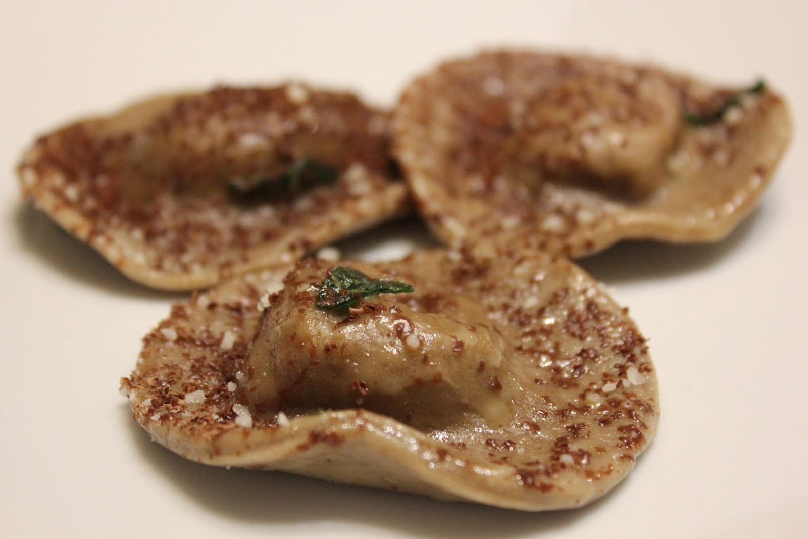 - On medium heat toss the cooked raviolis in the sage butter then transfer to a serving platter or dishes. Add 2 ounces of the cooking water to the pan and swirl with any residual butter. Spoon the butter sauce over the raviolis, then finish with a generous grating of Parmesan and bittersweet chocolate