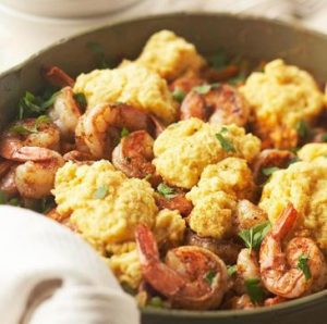 Stir in black-eyed peas, tomatoes, and the remaining 1/2 teaspoon Cajun seasoning. Spread mixture in an even layer. Drop Corn Bread Dumplings into eight mounds on top of shrimp mixture.