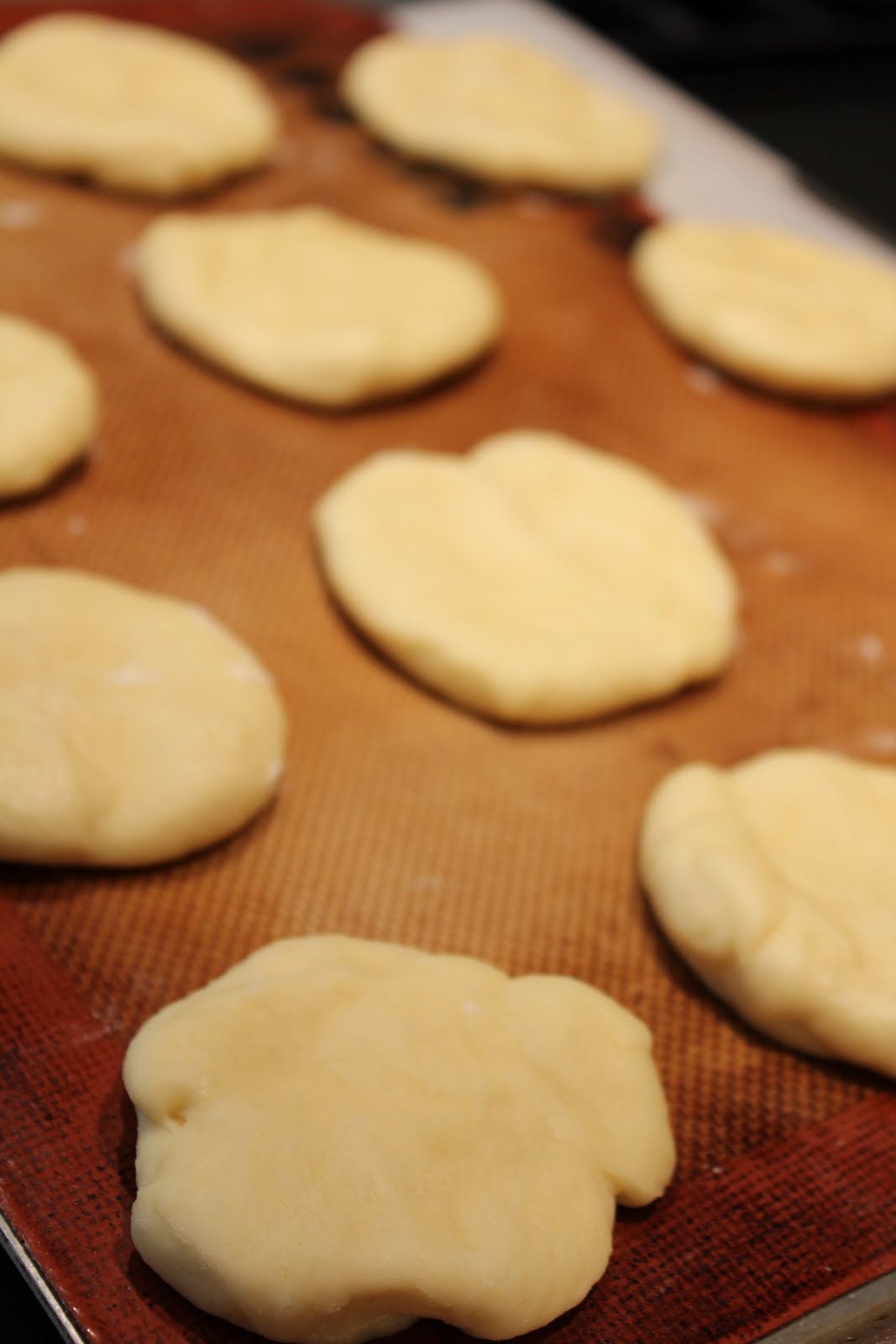 With lightly-floured hands, shape the dough into 12 balls. (You want to work quickly as the dough is the easiest to handle when it’s still cold.) Place the balls on two large parchment-lined baking sheets, allowing 1 inch space between the balls. Flatten them with your palm until they become 1/4-inch thick discs that are about 4-4.5 inches in diameter. Cover the dough discs with kitchen towels and let them rise once again for 45 minutes.